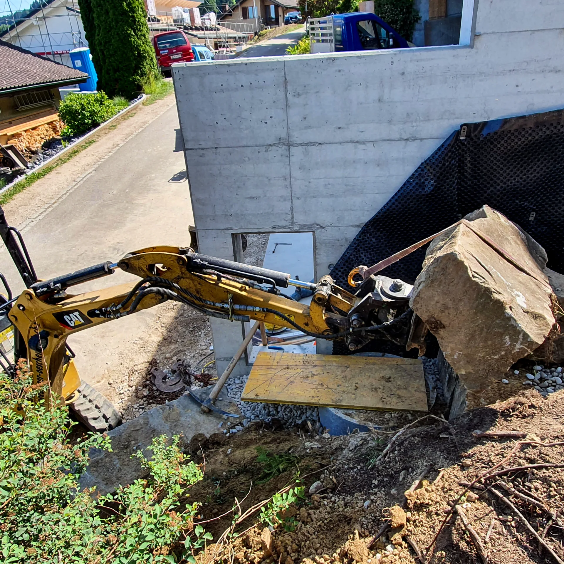 Fachgerechte Aushubarbeiten erbringen wir mit modernen Baggern. Wiederverwertbares Material deponieren wir, wenn möglich vor Ort. Nasses oder belastetes Material entsorgen wir fachgerecht in einer Deponie.